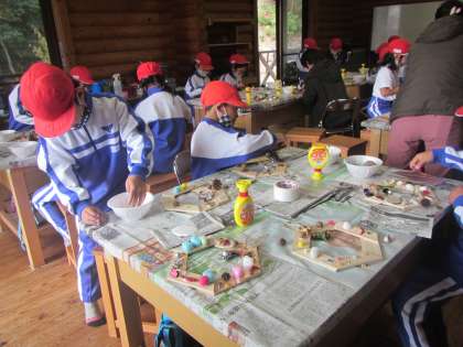 今日、2年生は運動公園にあるひだまりの郷へ行ってきました。森林散策をしたり、リースづくりをしたりしました。