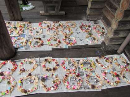 リース作りでは、ヒノキの木でできたリースに森にある実やモールなどの飾りをつけました。見たことのある銀杏の実や、はじめて見る木の実にとても興味津々でした。ボンドが乾いていないので、月曜日に持ち帰ります。袋を忘れずに持ってきてね。