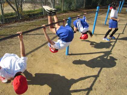 鉄棒に乗っかって両手をはなす「ふとんほし」や「まえまわり」など、はじめは「むり〜」と言っていた子も、練習を重ね、だんだんできるようになってきました。