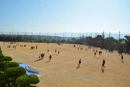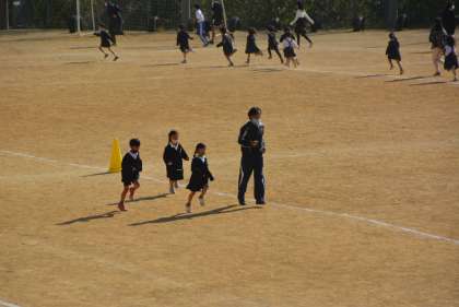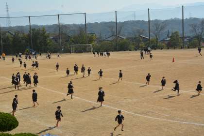 感染症拡大防止のために密を避けるため、2学年ずつ行うことにし、1〜3年は中の円、4〜6年は外の円を6分間走ります。