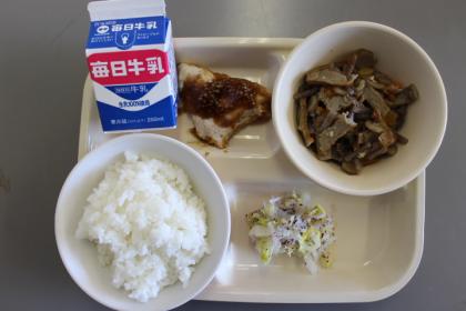 今日の献立は、牛乳・ごはん・蒸し鶏のしょうがだれ・ゆかり和え・五目金平です。ごちそうさまでした。(*^_^*)