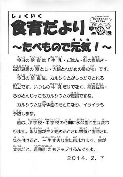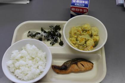 今日の献立は、牛乳・ごはん・サケの塩焼き・高野豆腐の卵とじ・大根とわかめの酢の物です。ごちそうさまでした。(*^_^*)