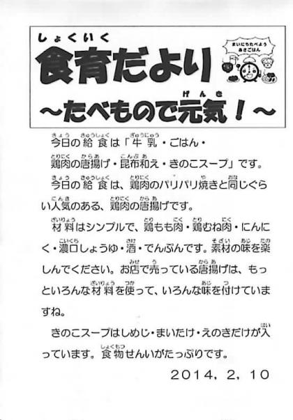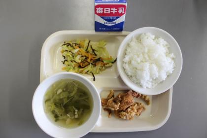 今日の献立は、牛乳・ごはん・鶏肉の唐揚げ・昆布和え・きのこスープです。ごちそうさまでした。(*^_^*)
