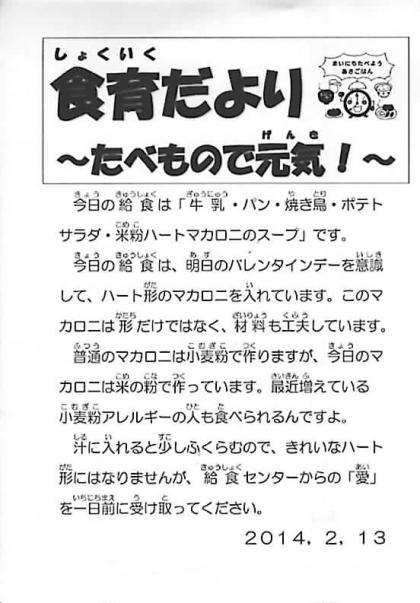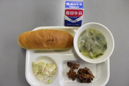 今日の献立は、牛乳・パン・焼き鳥・ポテトサラダ・米粉ハートマカロニのスープです。ごちそうさまでした。(*^_^*)