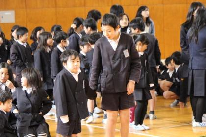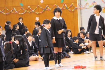 春待ち集会では、児童会主催で楽しいゲームをしました。縦割り班で協力しながら『テープの上でジャンケンポン』『かぶっちゃや〜よ!』が行われました。高学年が低学年をサポートする姿が見られ、また縦割り班での仲が深まったようです。