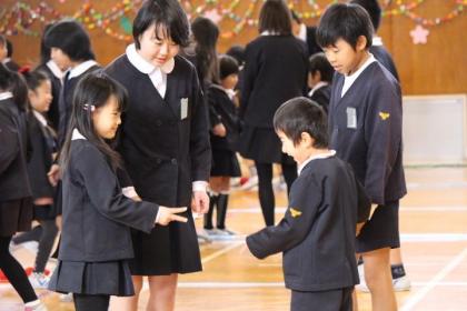 下:1年生を優しく見守る6年生。