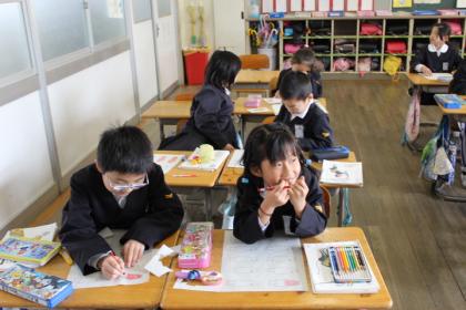 先日、きのくにチャレンジランキングが締め切られ、みんなで一緒に頑張れたことを喜び合いました。みんなで喜びあえるまで、たくさんのドラマがあり、なかなか全員でひとつの目標に向かうことは難しいことだと経験しました。1学期に勉強した「スイミー」も小さな魚たちが協力して大きな魚を追い出します。「スイミーのお話のように、3月までには大きな魚になるぞ」と頑張ってきました。やっとみんなで協力することを実感できたので、今日は一つの目標にみんなで目指せた証を残すことにしました。