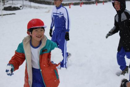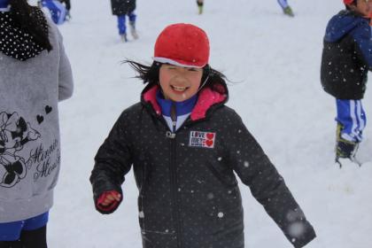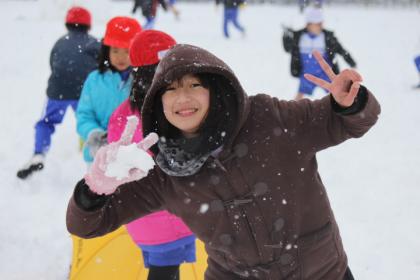 写真上:フカフカの新しい雪だよ〜、投げちゃうよ〜