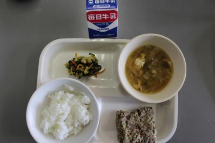 今日の献立は、牛乳・ごはん・ほねくの磯辺揚げ・ごま和え・みそ汁です。ごちそうさまでした。(*^_^*)