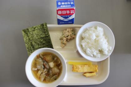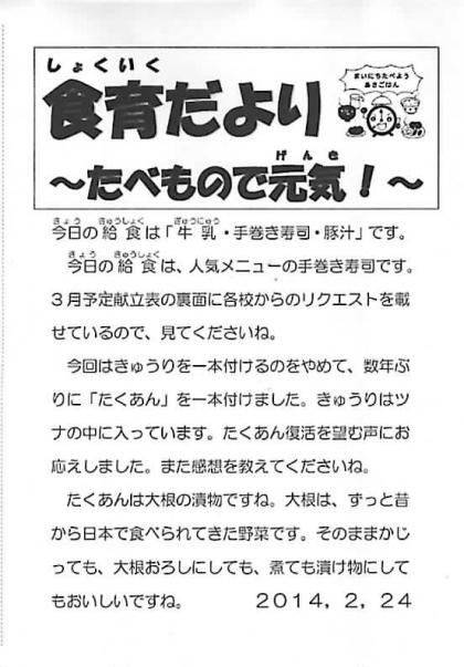 今日の献立は、牛乳・手巻き寿司(卵焼き、たくあん、ツナ)・豚汁です。ごちそうさまでした。(*^_^*)