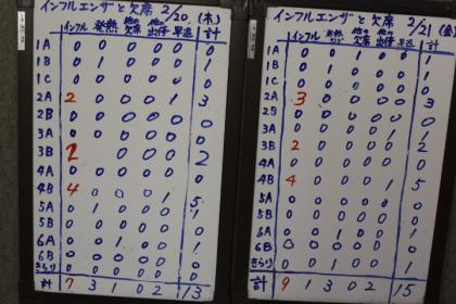 2年、3年、4年生でインフルエンザが見られます。風邪や体調をこわしている子ども達を含め、土・日にゆっくり休んで、月曜日には元気な顔を見せて欲しいです。お大事に。