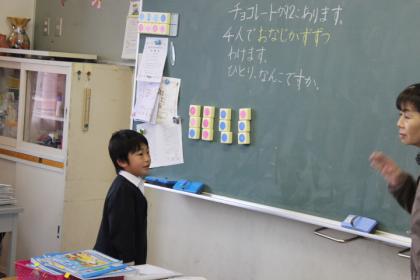 1年A組の算数では「おなじかずずつ」という単元の学習をしました。一見「1年生に解けるの!?」「かけ算やわり算を使うのでは!?」と思える問題が出ますが大丈夫。たし算・ひき算と算数ブロックがあれば、ちゃんと解けますよ。