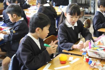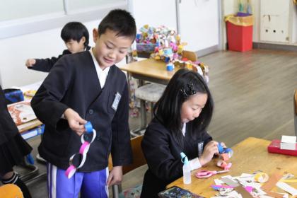 真っ白の帯には隠れメッセージを仕込んでいます。たくさんの場所に大活躍しそうな輪飾り。6年生を送る会で飾られたら、メッセージを見付けてもらえますように。