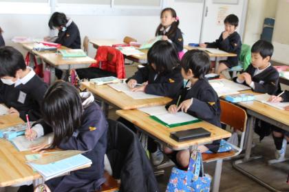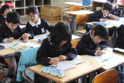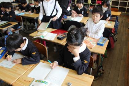 写真上:11人並んでいて、後ろに5人いたら、前には何人いるのだろう。並んだ図をかいて考えています。