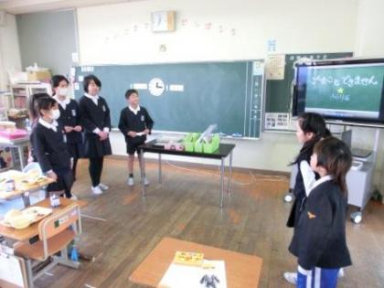下:6年生と一緒に記念撮影。後ろのテレビに映っているのが