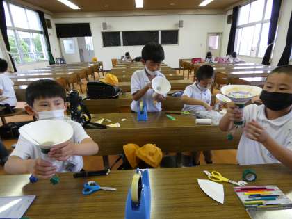紙皿や輪ゴム、トイレットペーパーの芯、ティッシュなどを使って、おもちゃを作りました。
