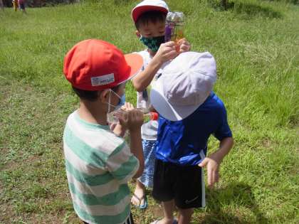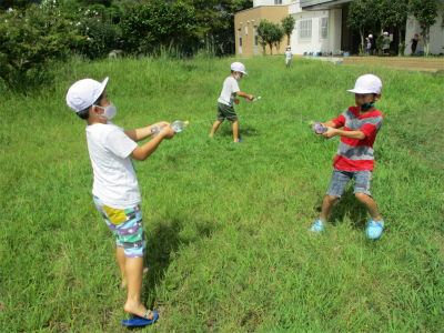 昨日の生活の時間に水鉄砲遊びをしました。自分たちで色を塗ったり、絵をかいたペットボトルを使いました。