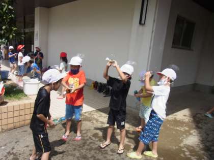友達同士で水をかけあったり、自分でかけたりして楽しんでいました。自分から「水をかけて。」とお友だちに言っている子もいました。