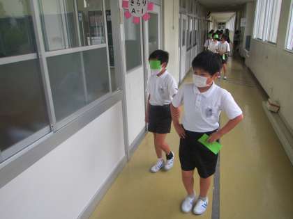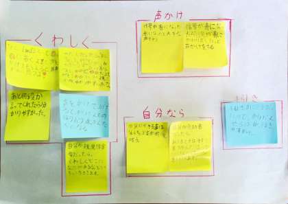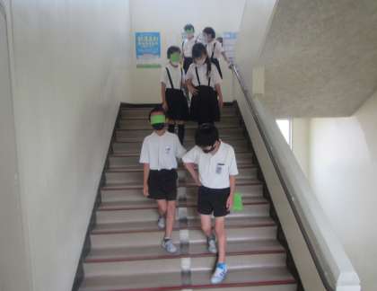総合の時間に、視覚障害について勉強しました。目が見えなかったり、見えにくかったり、色が分かりにくかったりすること、介助(手引き)の仕方などについて学習しました。次に、アイマスクを作って、視覚障害者体験をしたり、介助者として手引きをしたりしました。授業の最後に、視覚障害の人にはどんな声掛けが必要か、どんな声掛けがあればうれしいのかを話し合い、グループで1枚の紙にまとめました。