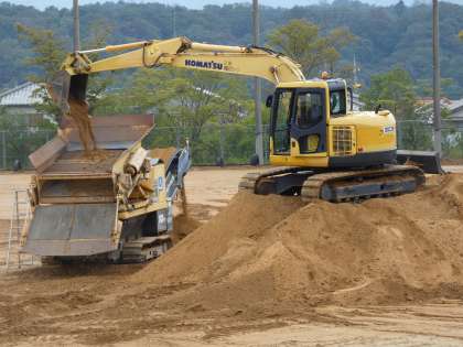 これまでに掘り起こした運動場の砂をショベルカーで重機の上に入れると、ふるいになっていて、石は手前に落ちて、細かい砂は奥のベルトコンベヤーにのせられて出てきます。