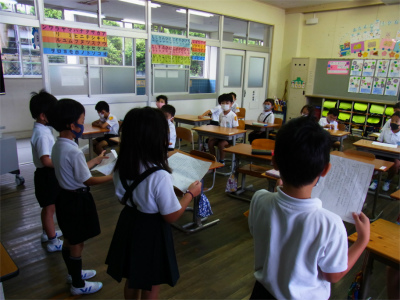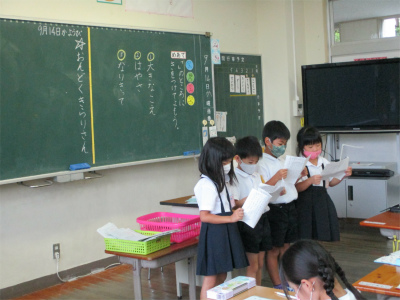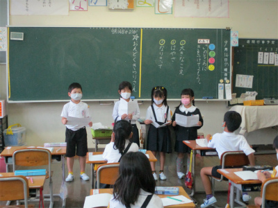 今日は、国語で学習をしてきた『やくそく』の音読発表会をしました。今までの音読は、大きな声ですらすらと読むことがめあてでしたが、今回は、登場人物の気持ちを考えながら台詞を言うことができるように、頑張って練習をしてきました。
