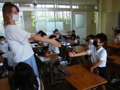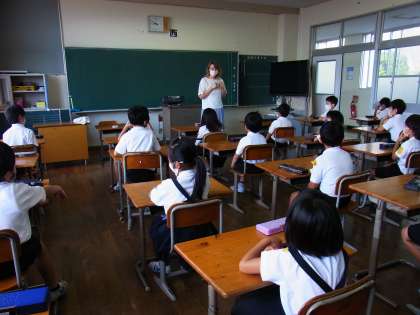今日は初めての外国語がありました。ALTのユリア先生に英語の歌やあいさつの仕方を教えてもらいました。