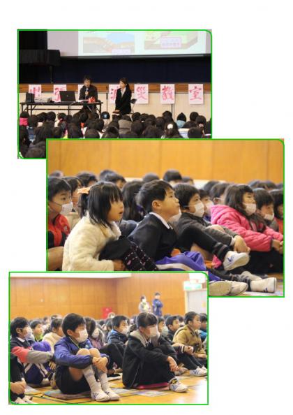 地震のしくみ・南海トラフの位置・阪神淡路大震災、東日本大震災の被害状況・地震、津波に備えて・釜石の軌跡(アニメ)・・・などを、和歌山県庁総合防災課の方から、子どもたちにわかりやすくお話ししていただきました。