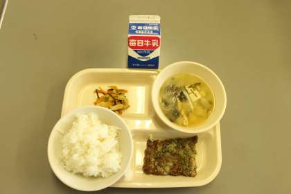 今日の給食の献立は、ごはん・骨くの磯辺揚げ・昆布和え・みそ汁・牛乳です。ごちそうさまでした。