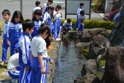 写真上:わー、鯉が泳いでいるよ。下水がこんなにきれいになったんだ。
