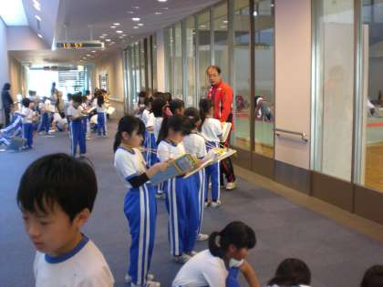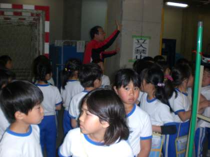 質問の時間には、10年以上経っているのにきれいなわけや、蛍光灯や電球がたくさんついてこと、建物のデザイン、利用している人など、多くの質問が出ました。みんな、橋本体育館博士になれるんじゃないかと思ったほどです。