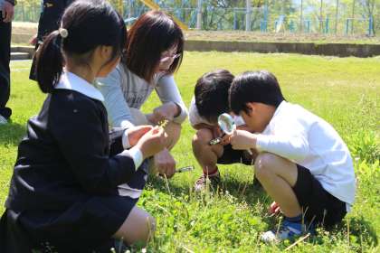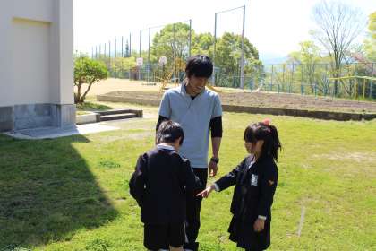 写真上:「ねえ、先生 ほら見て。」「どれどれ。」