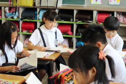 内容読みとりのために、隣の友達と一文交代読みをしています。