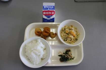 今日の給食の献立は、ごはん・えびフリッターのチリソース・千切り大根の煮物・おかか和え・牛乳です。ごちそうさまでした。