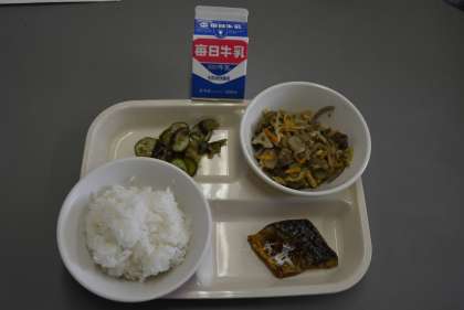 今日の給食の献立は、ごはん・鯖の塩焼き・どろぼうなす・牛肉と切干の甘辛煮・牛乳です。ごちそうさまでした。