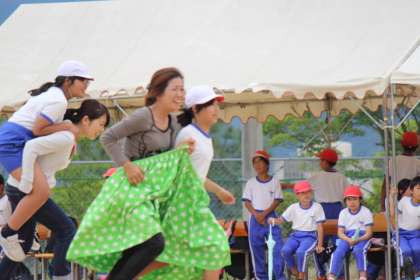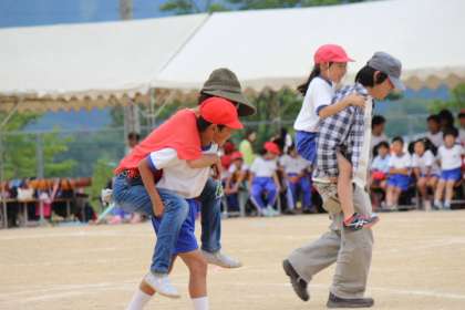 写真上:6年生の娘をおんぶするのは今日が最後かも?!(学年競技)