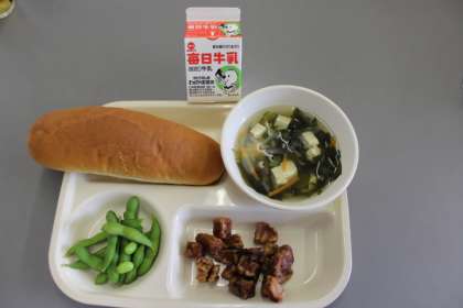 運動会の振替休業明けの 今日の給食の献立は、パン・豚肉のバーベキューソース・豆腐スープ・枝豆・牛乳です。