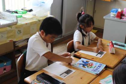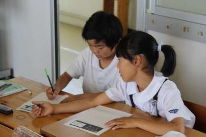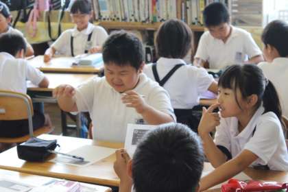 算数の時間、箱に入ったボールの直径に目をつけて、箱のたての長さを計算する問題をグループで考えました。答えは出ても、数字が何を表すのかを説明するのが難しかったようで、一生懸命考えていました。