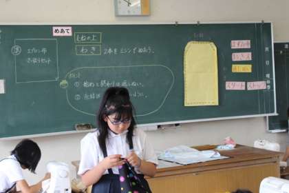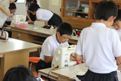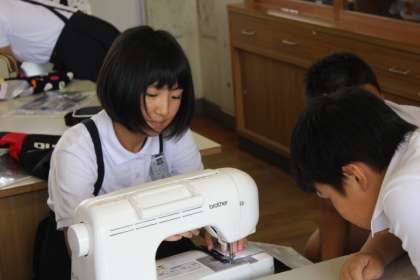 友達同士で教え合ったりチェックし合ったり、みんなで協力しながらエプロン作りを進めていました。