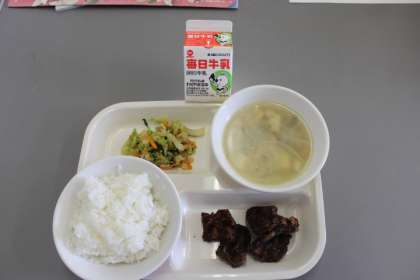 今日の給食の献立は、ごはん・クジラの竜田揚げ・アーモンド和え・あさりのみそ汁・牛乳です。ごちそうさまでした。