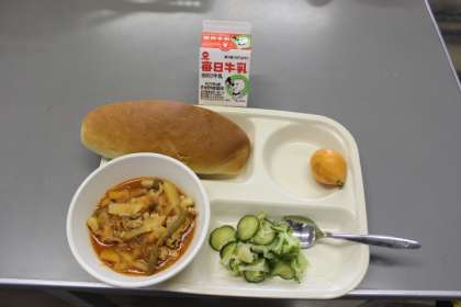 今日の給食の献立は、パン・ポークビーンズ・グリーンサラダ・びわ・牛乳です。ごちそうさまでした。