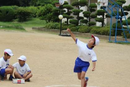今日の体育では、スポーツテストのソフトボール投げをしました。