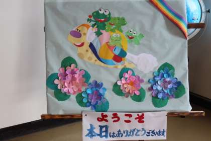 写真上:本校の玄関を入ったところに、今月のかざりとして、