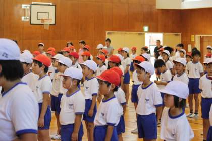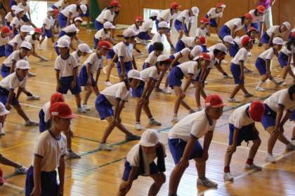 林校長先生の激励の言葉を聞き、準備体操に取り組んでいます。
