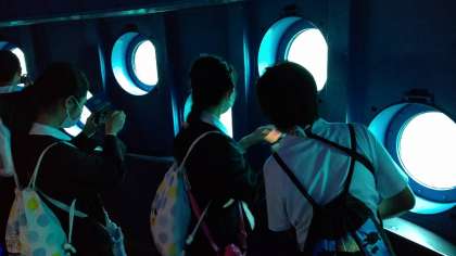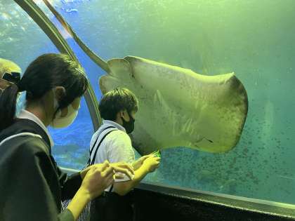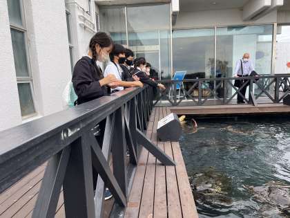 昼食後はグループで展望塔や水族館で海の生き物を見て楽しみました。また、ウミガメのエサやりもしました。