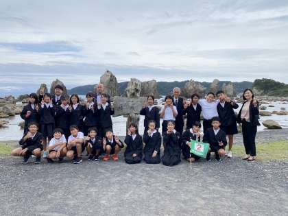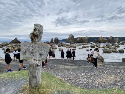 橋杭岩で記念写真を撮りました。思った以上に潮が満ちています。なんとか天気はもちそうです。