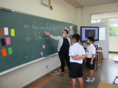 今日は、英語の学習がありました。「I can sing a rainbow」をみんなで楽しく歌った後、色の発音の学習をしました。「What color do you like.」と質問したり、「I like red and blue.」と2色好きな色を答えたりしました。先生の発音をよく聞いて、上手な発音でお話しすることができた2年生!発音を褒めてもらって、すごく嬉しそうにしていました♪