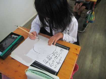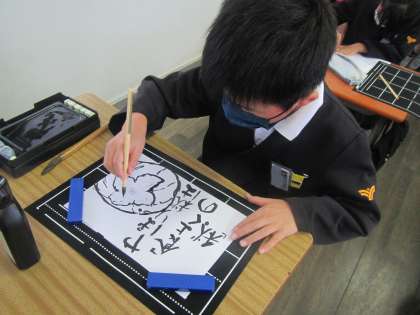 水曜日に続いて、頂いた柿の絵を描きました。今日は、鉛筆で描いた線を小筆と墨汁でなぞりました。文字や柿の輪郭の線は力強く、へたの細かい線は筆を立ててゆっくりと描いていきました。墨汁で描くことで、味わい深い作品ができてきました。