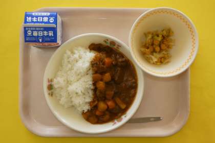今日は、子どもたちの大好きな「ビーフカレー」でした。角切りの牛肉がたくさん入っていて、「ビーフ」の存在をしっかりと感じられました。「ひよこ豆のサラダ」は、しょうゆ、酢、砂糖で味付けされていて、さっぱりとしていました。今日も栄養満点でした。