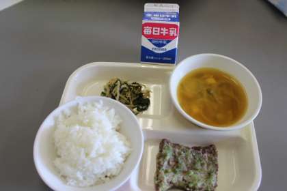 今日の給食の献立は、ご飯・ほねくのいそべ揚げ・胡麻和え・かぼちゃの味噌汁・牛乳です。ごちそうさまでした。