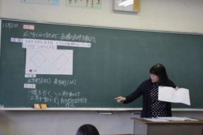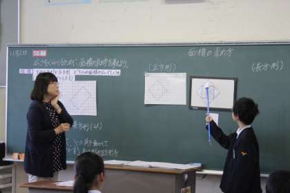 問題の図形は、方眼紙にかかれた 辺の長さがわからない正方形と長方形でした。三角形を合わせたら 正方形や長方形になるという考え方や、ますを数える考え方を使って、一人ひとりが真剣に考えました。